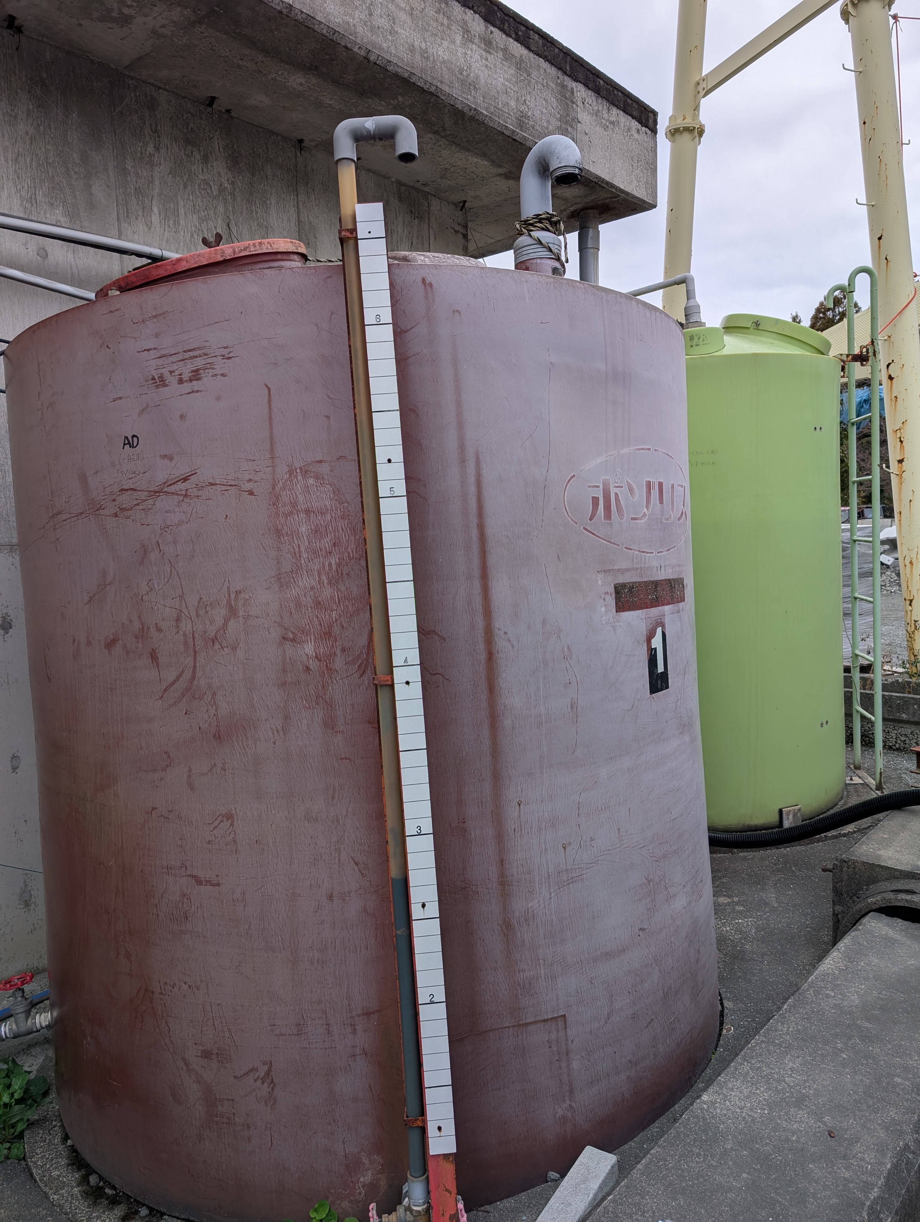 その先の広い所で向きを変えてタンク横に着ける。(道を塞いでいい)