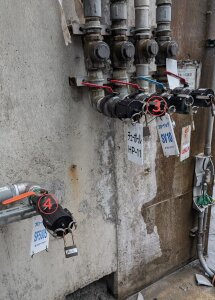 缶はAE剤は事務所横、DFは小屋の中。