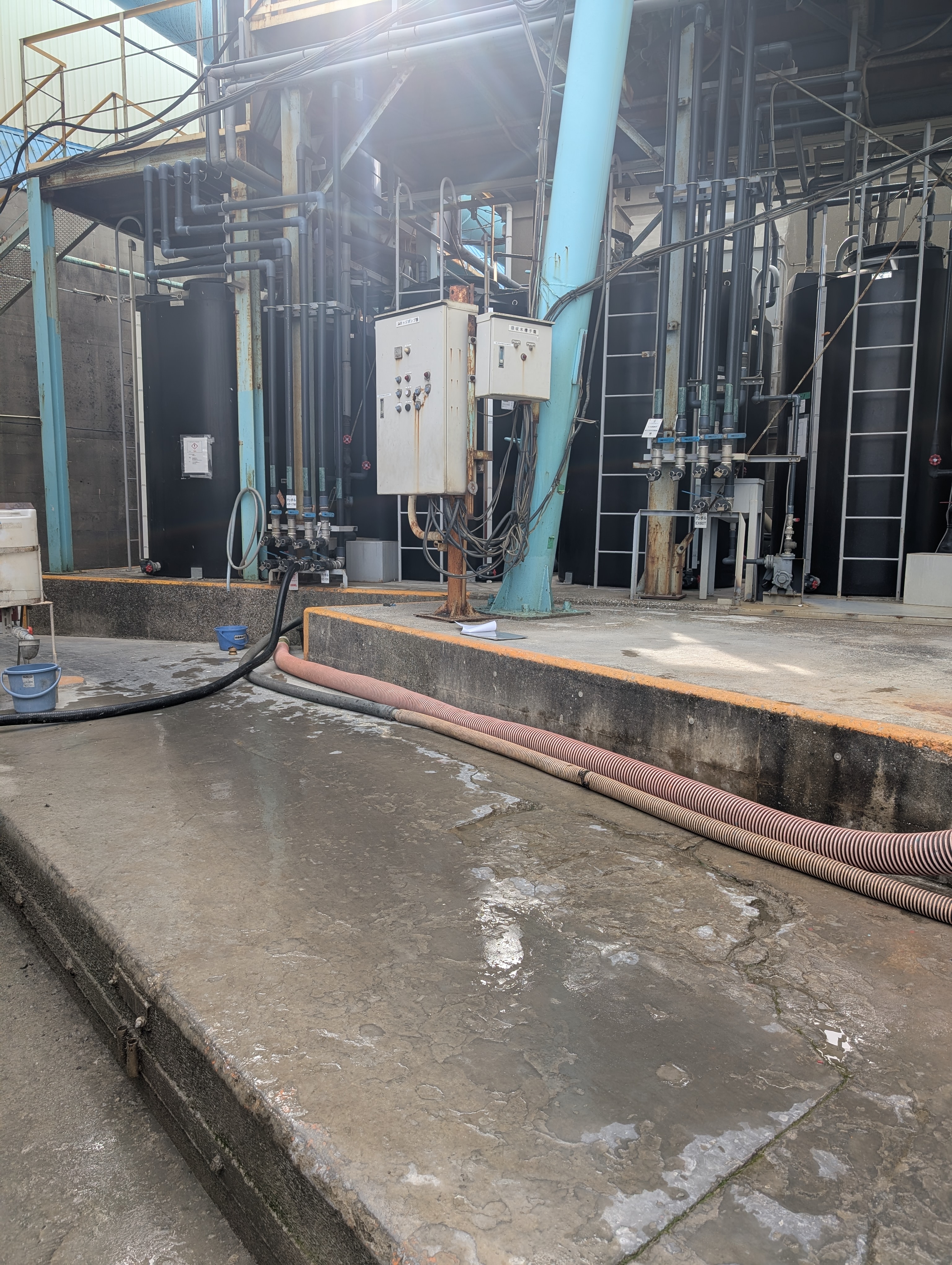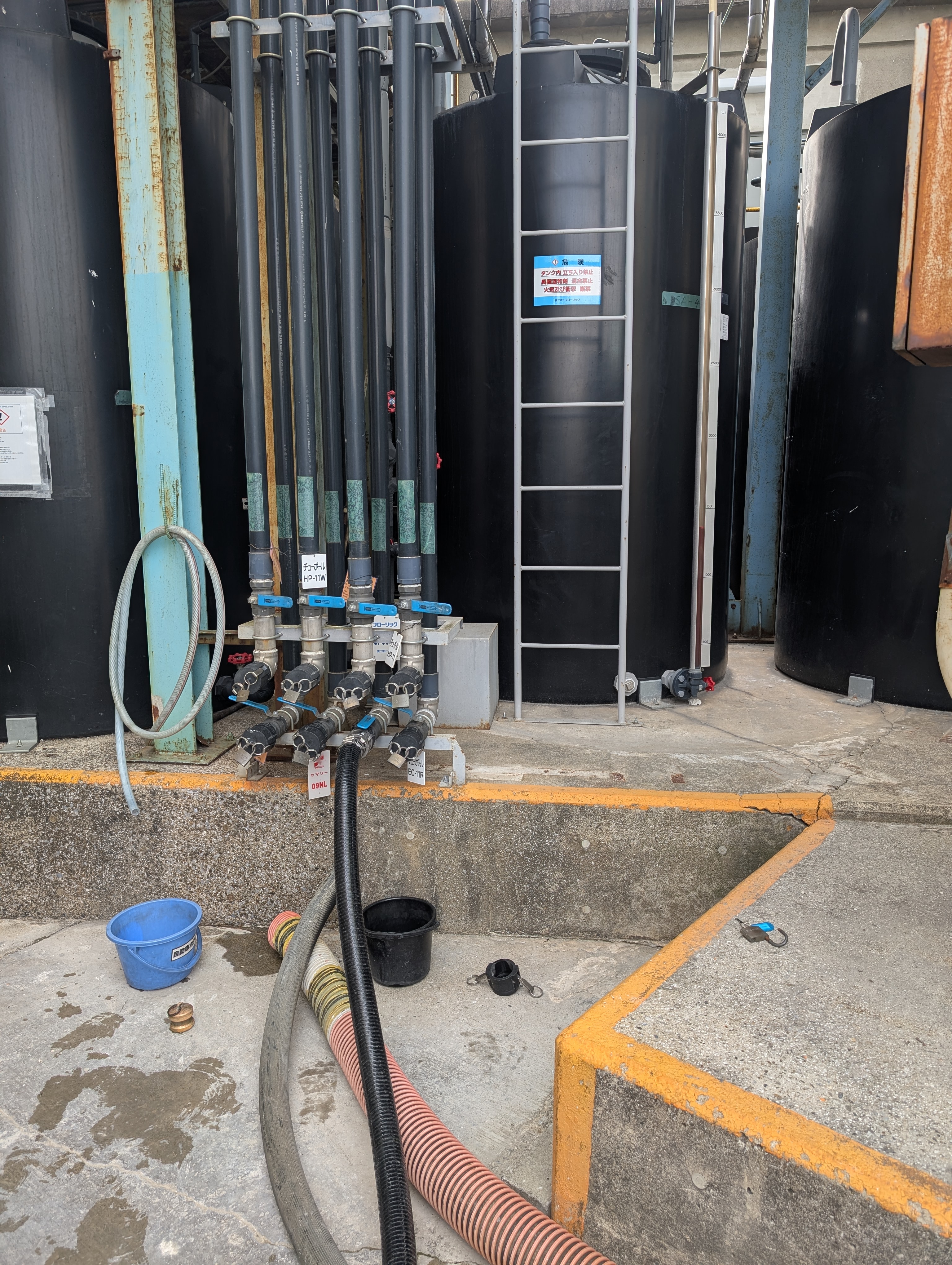 頭から入場、バラの小屋にケツを入れて向きを変えプラント横にバックする。(下がりすぎると後ろからセメントガラが落ちてくるので注意。)